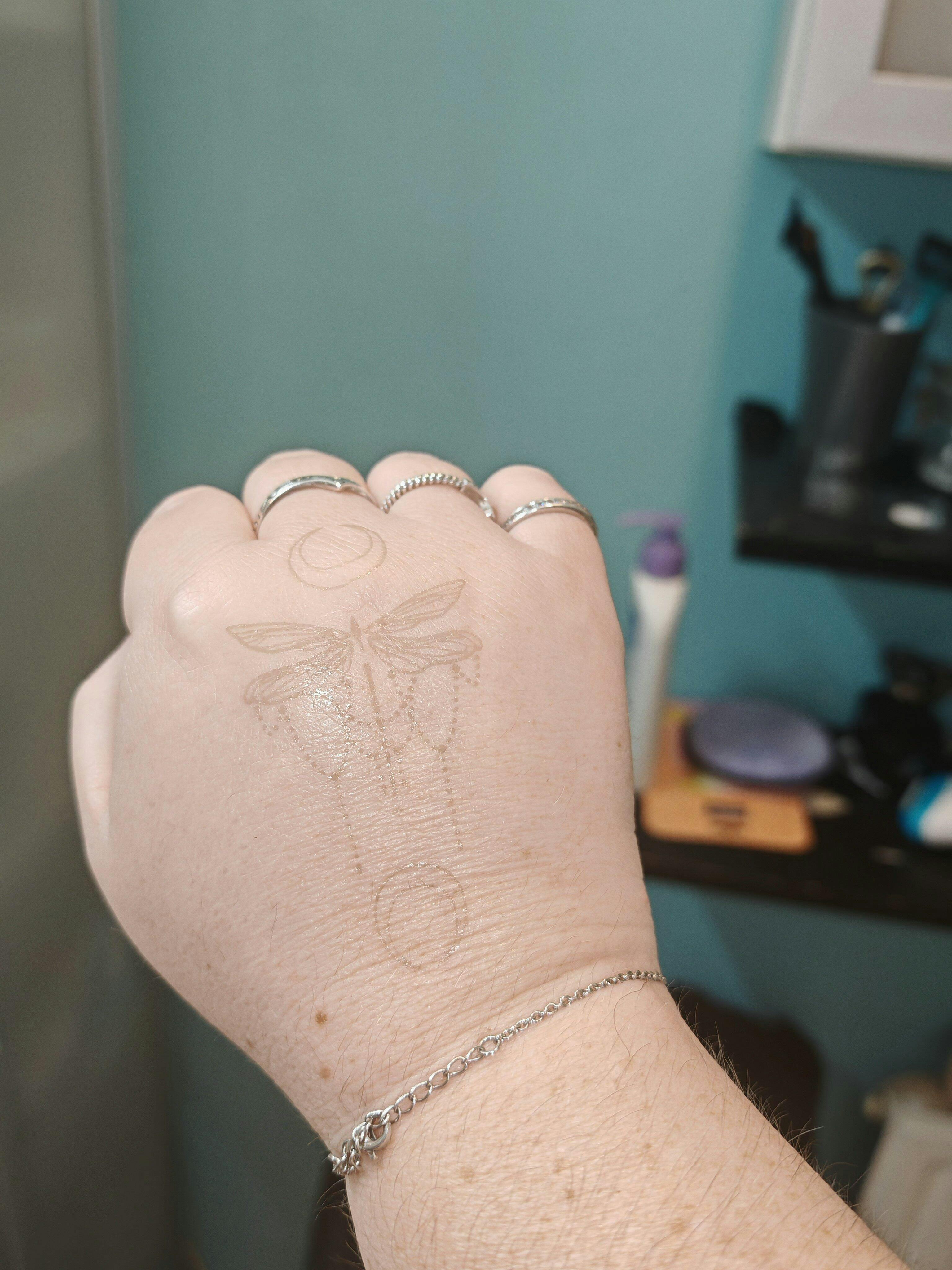 Uma tatuagem que se desvanece gradualmente. A tatuagem desvanece-se entre 1 e 2 semanas, consoante o seu tipo de pele. Pode acelerar o processo de remoção com a nossa luva esfoliante, concebida para uma remoção suave.